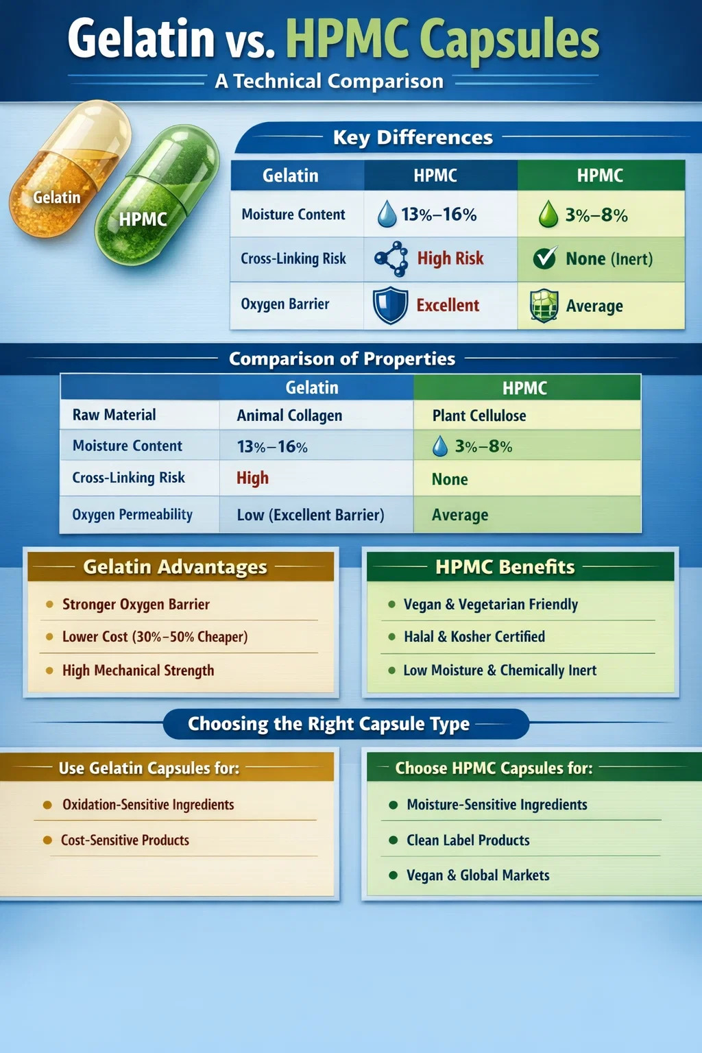 Для большинства современных добавок и фармацевтических применений ГПМЦ капсулы технически превосходят традиционным желатиновым капсулам. Они решают наиболее распространенные проблемы стабильности, связанные с желатином, такие как хрупкость при низкой влажности и реакции сшивки. Кроме того, поскольку HPMC имеет растительную основу, он мгновенно удовлетворяет диетические потребности самого широкого круга потребителей, включая вегетарианцев и тех, кто соблюдает законы Халяль или Кошер.