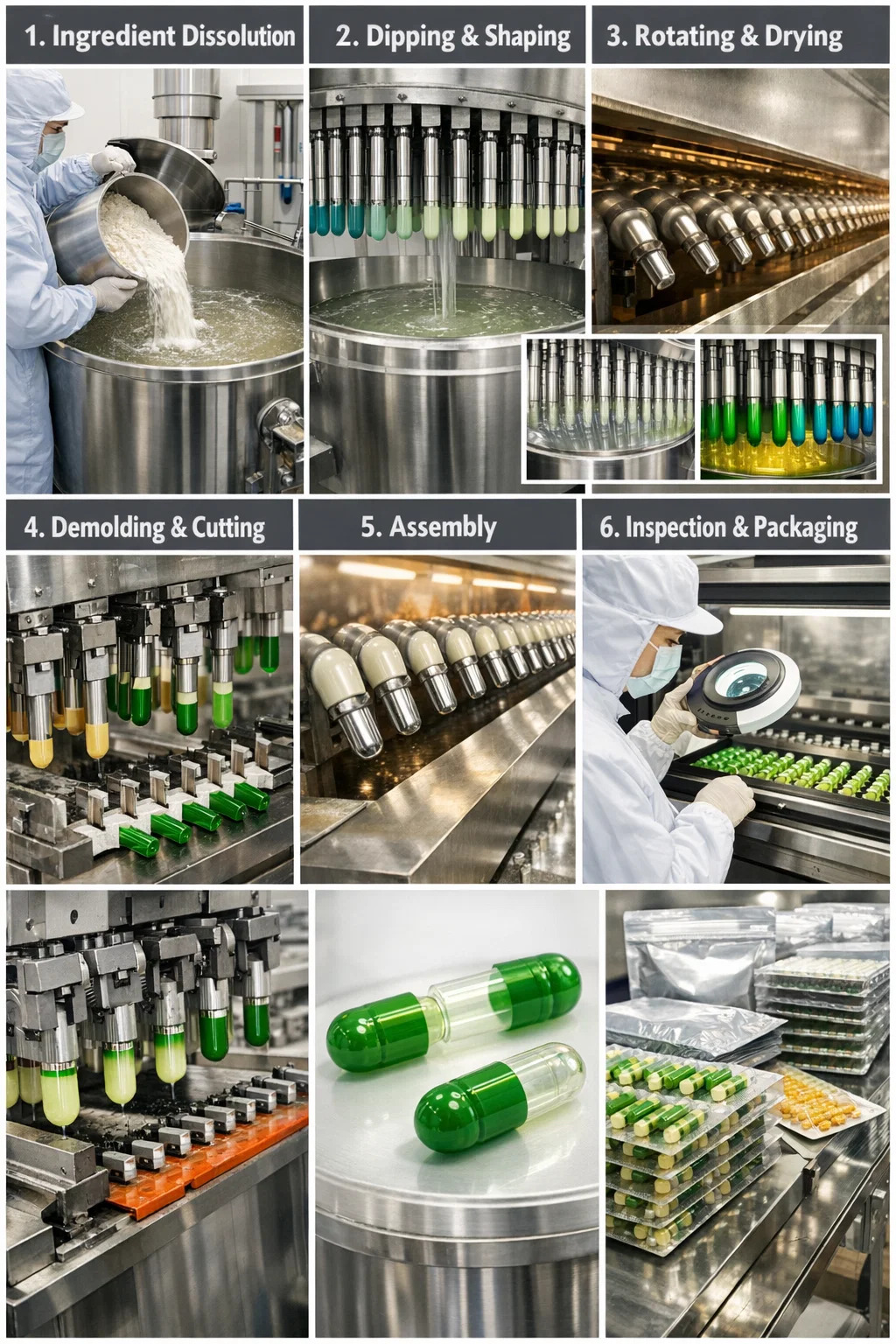 Добавление цвета: если клиент заказывает цветные капсулы на растительной основе, на этом этапе добавляется пищевой краситель (например, натуральный хлорофилл или диоксид титана), чтобы окрасить «клей» до желаемого оттенка.