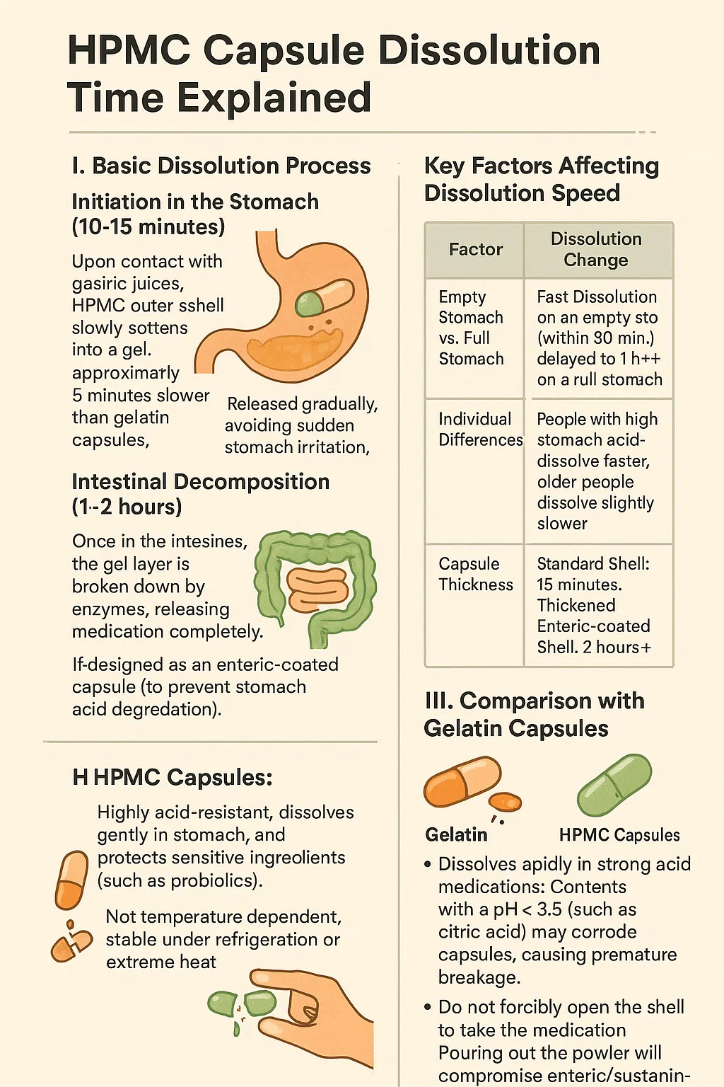 При контакте с желудочным соком внешняя оболочка ГПМЦ медленно размягчается в гель, примерно на 5 минут медленнее, чем желатиновые капсулы .