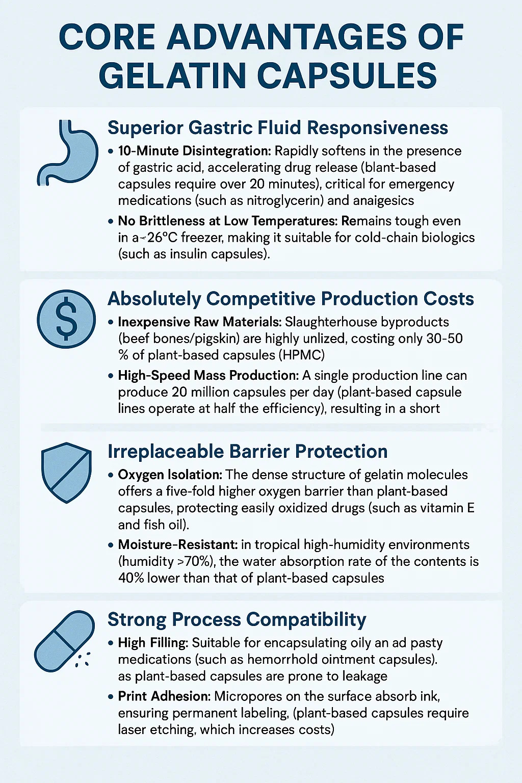 Выделение кислорода: плотная структура молекул желатина обеспечивает в пять раз более высокий барьер для кислорода, чем капсулы на растительной основе, защищая легко окисляемые препараты (такие как витамин Е и рыбий жир).