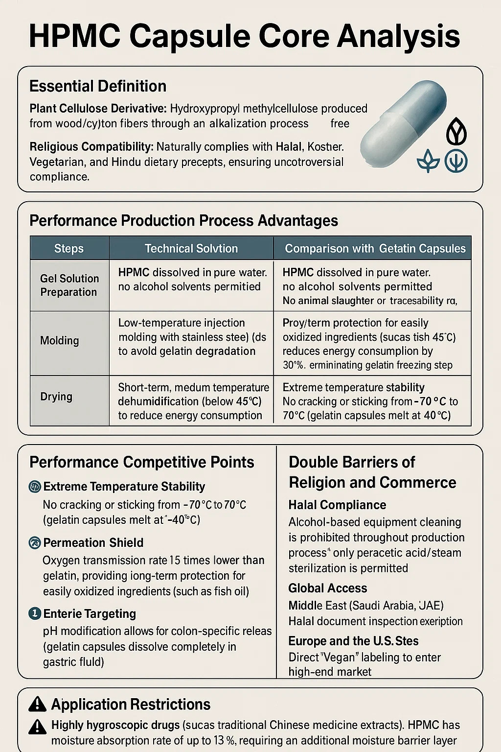 **Высокогигроскопичные лекарственные средства (например, экстракты традиционной китайской медицины): HPMC имеет степень поглощения влаги до 12%, что требует дополнительного влагозащитного слоя.